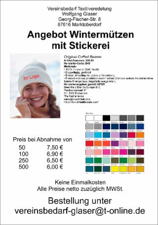 Aktuelle Angebote![]() ![]() Herzlich willkommen bei Textildruck Glaser![]() Wir bedrucken, beflocken oder besticken Ihre Textilien in eigener Werkstatt. Vom ersten Entwurf bis zur Fertigstellung findet alles in unserem Hause statt. Sie als Kunde werden dabei Schritt für Schritt mit einbezogen, so dass das Endergebnis zu 100% mit Ihren Vorstellungen übereinstimmt. Kontaktieren Sie uns. Gerne informieren wir Sie.vereinsbedarf-glaser@t-online.deoder per Telefon zu den Geschäftszeiten 08342/4742Ihr Team von Textildruck Glaser |