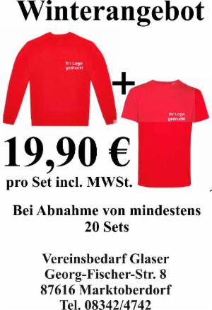 Aktuelle Angebote![]() ![]() Herzlich willkommen bei Textildruck Glaser![]() Wir bedrucken, beflocken oder besticken Ihre Textilien in eigener Werkstatt. Vom ersten Entwurf bis zur Fertigstellung findet alles in unserem Hause statt. Sie als Kunde werden dabei Schritt für Schritt mit einbezogen, so dass das Endergebnis zu 100% mit Ihren Vorstellungen übereinstimmt. Kontaktieren Sie uns. Gerne informieren wir Sie.vereinsbedarf-glaser@t-online.deoder per Telefon zu den Geschäftszeiten 08342/4742Ihr Team von Textildruck Glaser |
